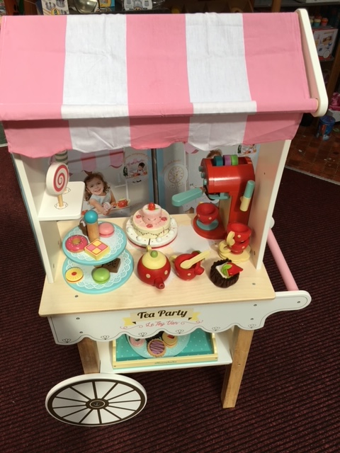 This sturdy wooden cart is a cafe on wheels, that works brilliantly with our wooden tea-set, the wooden coffee machine and a cake stand to name just a few of our available tea time play sets. Features a pull out draw and two wooden lollies.