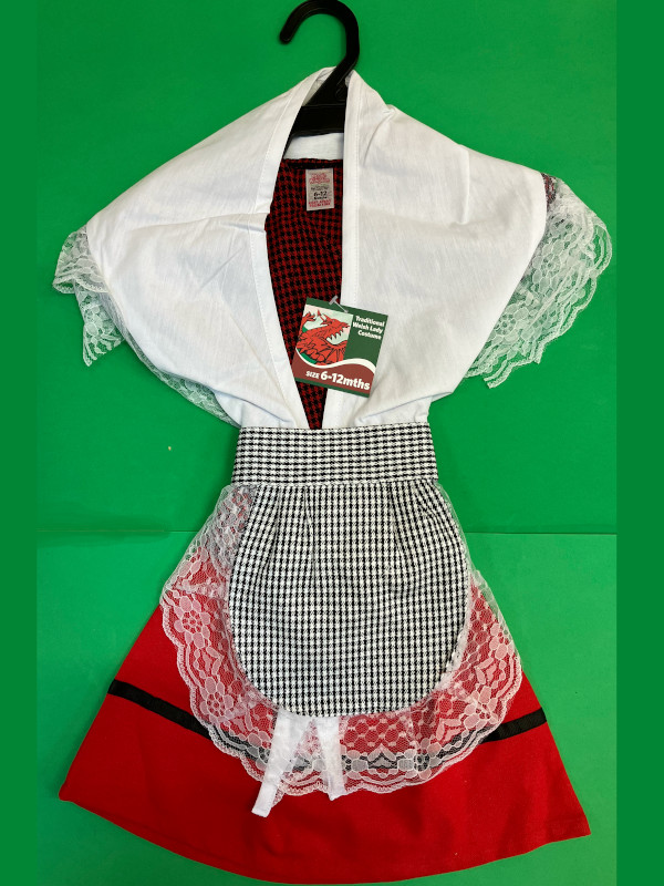 Our traditional costumes for little Welsh ladies start from 0 months. As well as individual shawls and pinnies we sell all in one costumes, which make a fantastic full outfit when matched with the traditional hat.